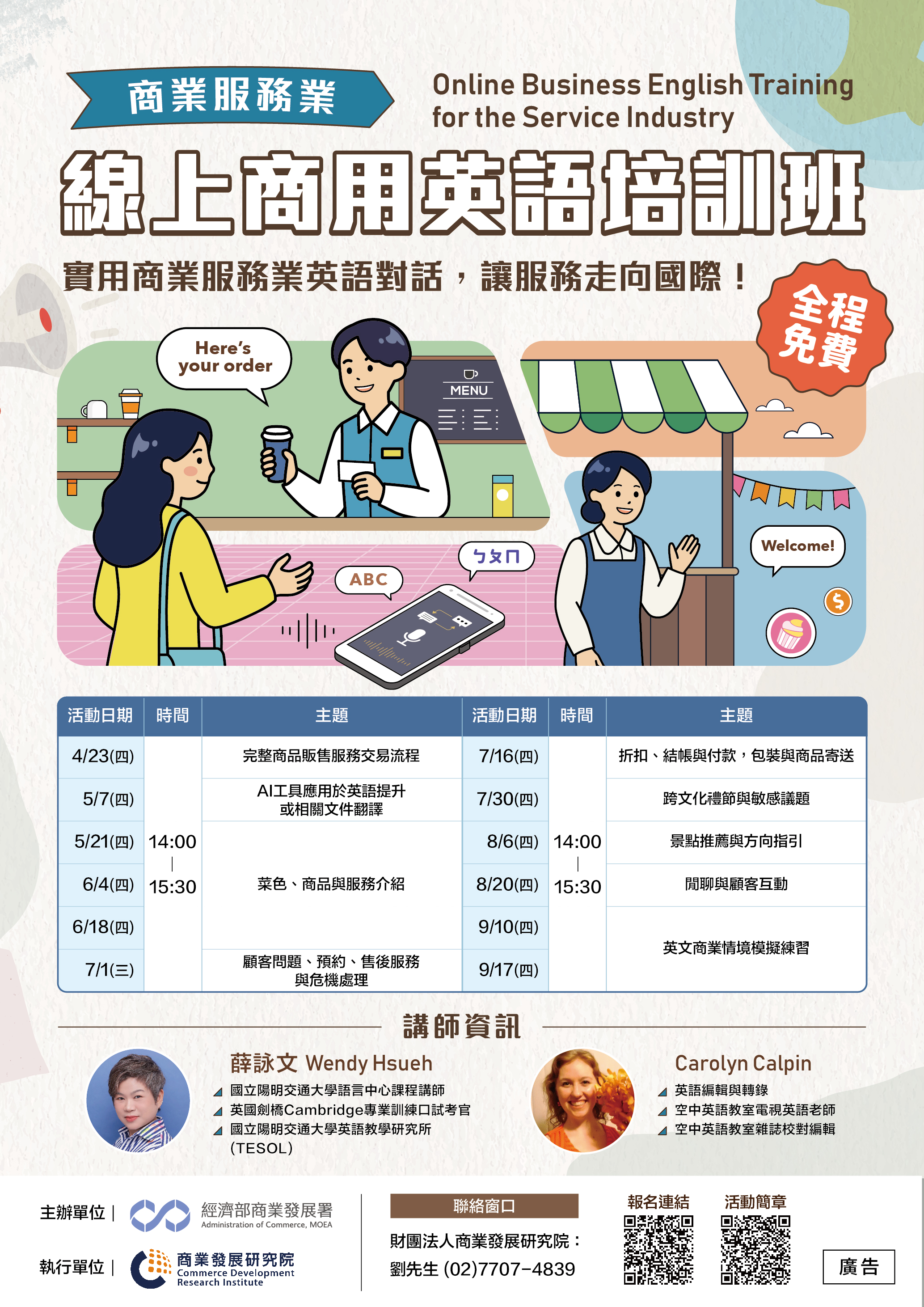 商業發展研究院2026商業服務業線上商用英語培訓班訂於4月23日~9月1日每週四(7/1為週三)採線上授課模式–全程免費!有意參加之會員逕向該院線上報名,或電02-77074839劉先生洽詢!提供會員參考。